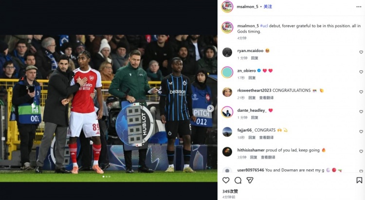 16岁枪手小将萨尔蒙晒照纪念欧冠首秀:我将永远为此而感恩