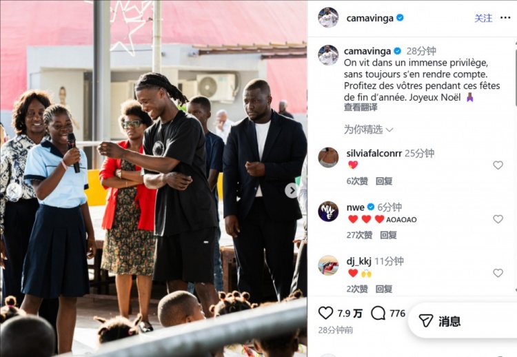 卡马文加在当地受到了热烈欢迎,他晒出了自己的照片,写道:“我们生活在极大的特权之中,却并不总能意识到这一点。请在这些岁末佳节里,好好陪伴你们的亲人。圣诞快乐 ????????”